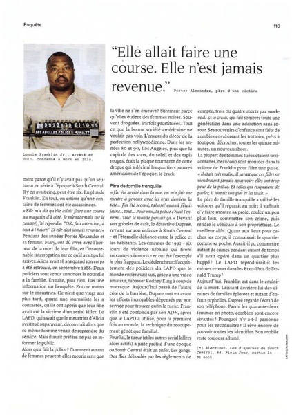 C’est pour comprendre les raisons de ce silence que Cécile Delarue, journaliste française, a mené l’enquête. Dans "Black-Out, les disparues de South Central", on suit son investigation à la recherche de réponses. Comment imaginer qu’aux Etats-Unis, des meurtres puissent être commis impunément pendant des années ? Parce que les victimes sont toutes des femmes ? Des femmes noires ? Des femmes noires toxicomanes et/ou prostituées ? Battant en brèche tous les préjugés, elle a rencontré et questionné les différents protagonistes de ces affaires sordides, policiers, enquêteurs, familles... Tous sauf un.